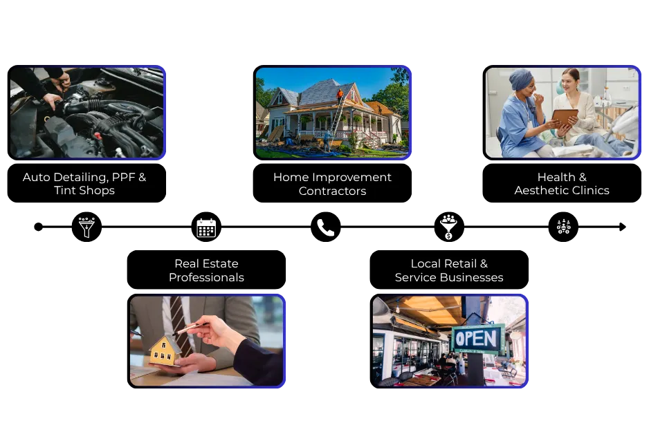 We specialize in local service-based businesses, auto detailing, home improvement, med spas, and more. If your business relies on consistent bookings or consultations, this system was built for you.